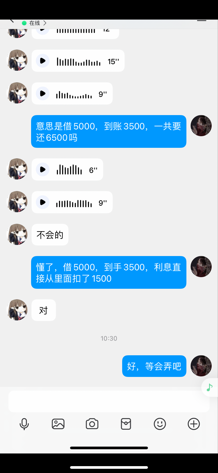 借5k ,到手3.5k,妈的利息1500,合计一天50利息