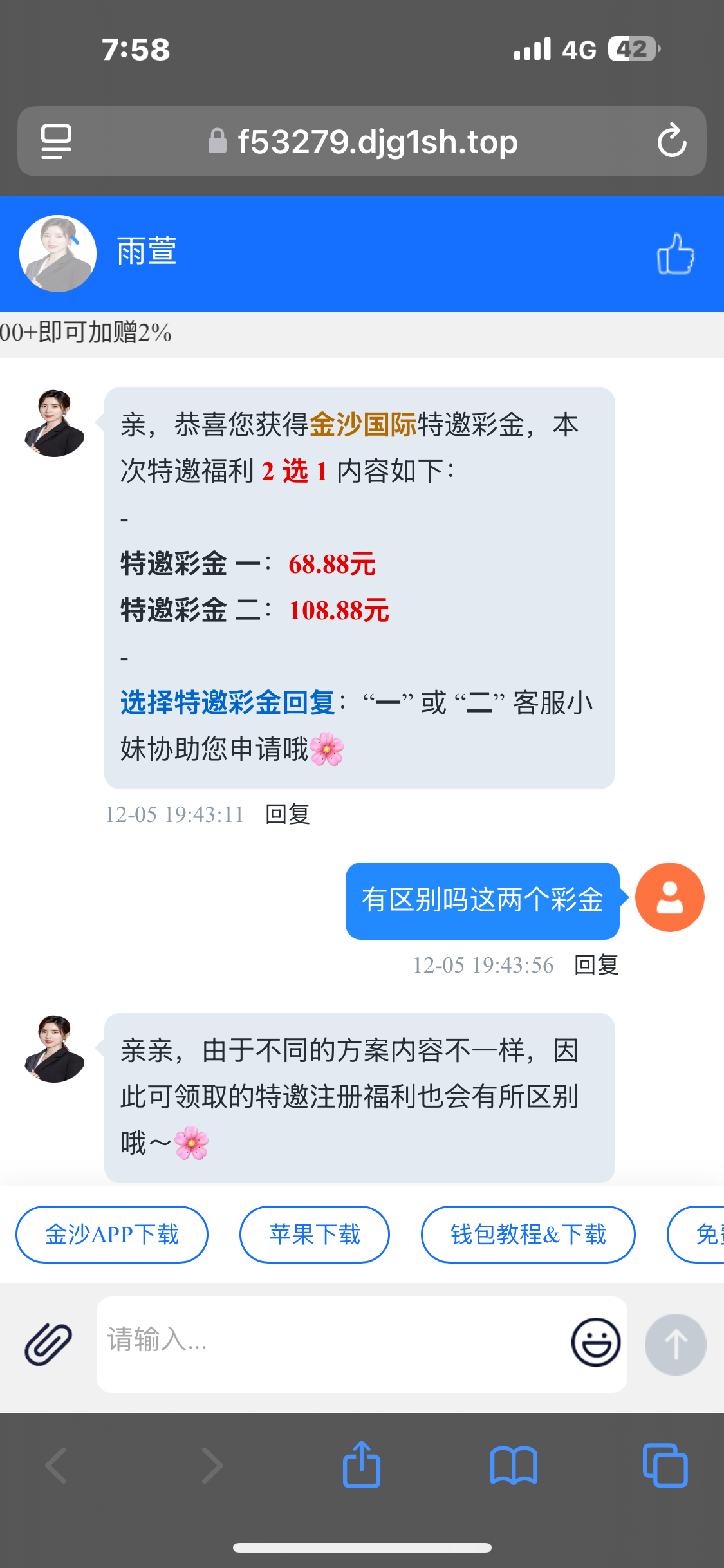 以前收到这种信息注册好问客服要就给,现在发截图客服给你发存送活动,两次了,另一个短信还写着,打够100可取,真扯