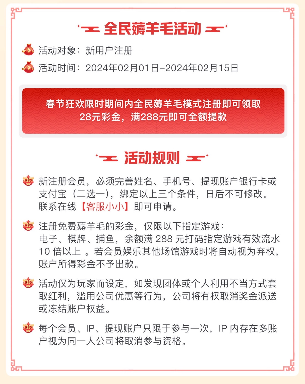春节狂欢限时期间内全民薅羊毛模式注册即可领取28元彩金,满288元即可全额提款!  绑定银行卡+支付宝 联系客服小小申请 仅限电子和捕鱼游戏