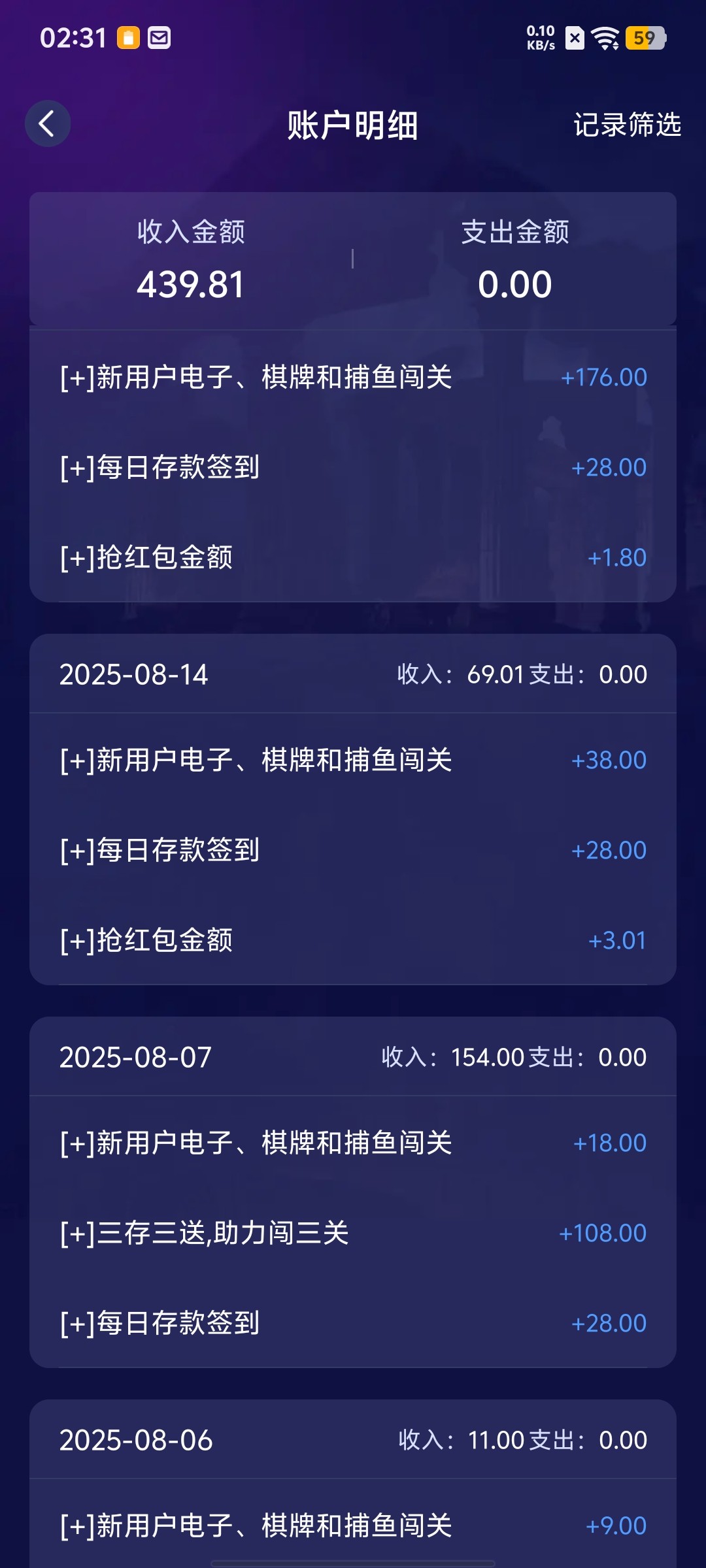 尘落 非凡存了几千,除了论坛抢楼没领官网任何彩金,你这送个188或者108吧,happy2046