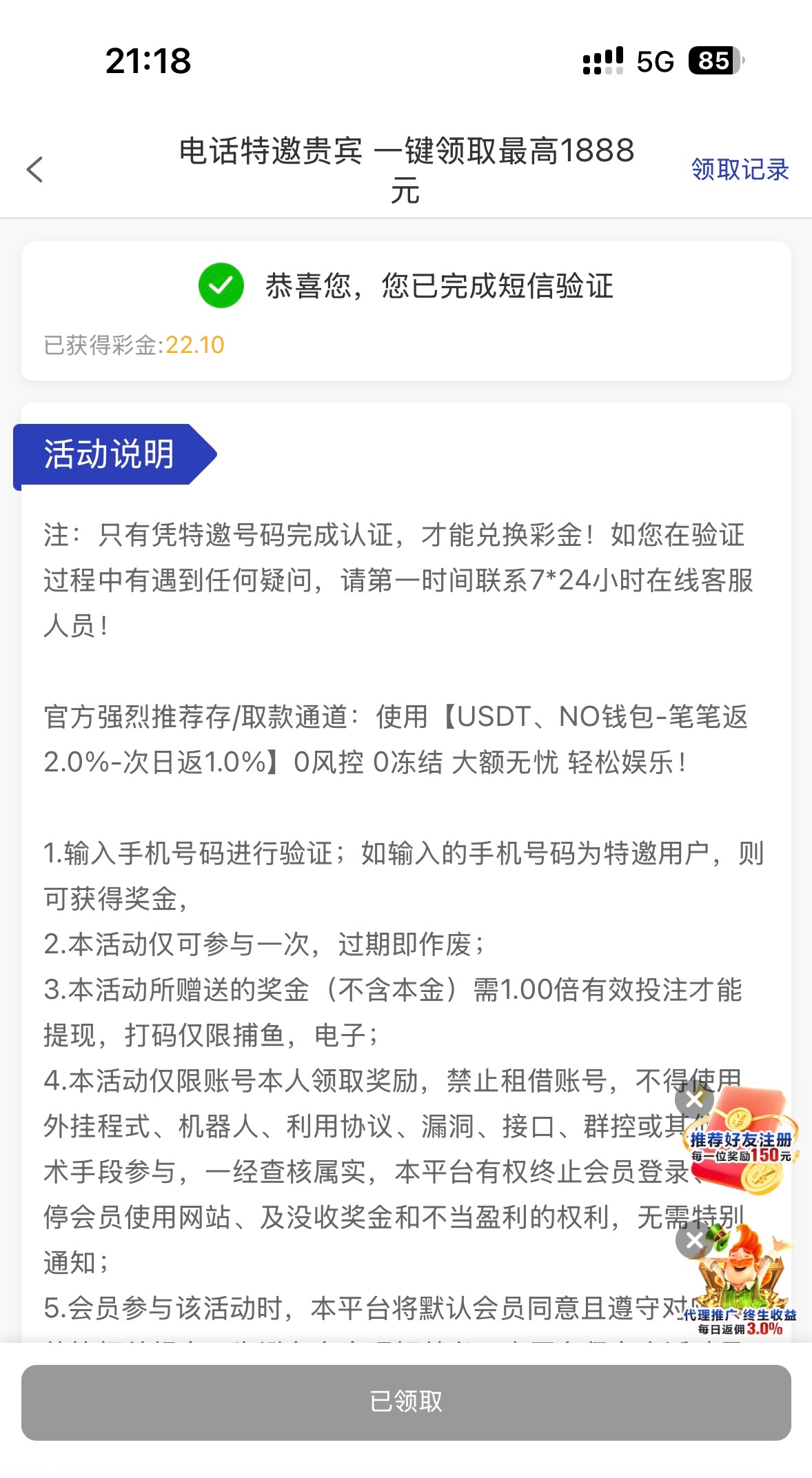注册下载活动专区自行申请特邀彩金,新人首存50+54,打够流水就能提,相当于以小博大想打的去试试,详情看活动介绍,玩过的注意一下,第二天还有免费红包雨和摇钱树可以申请