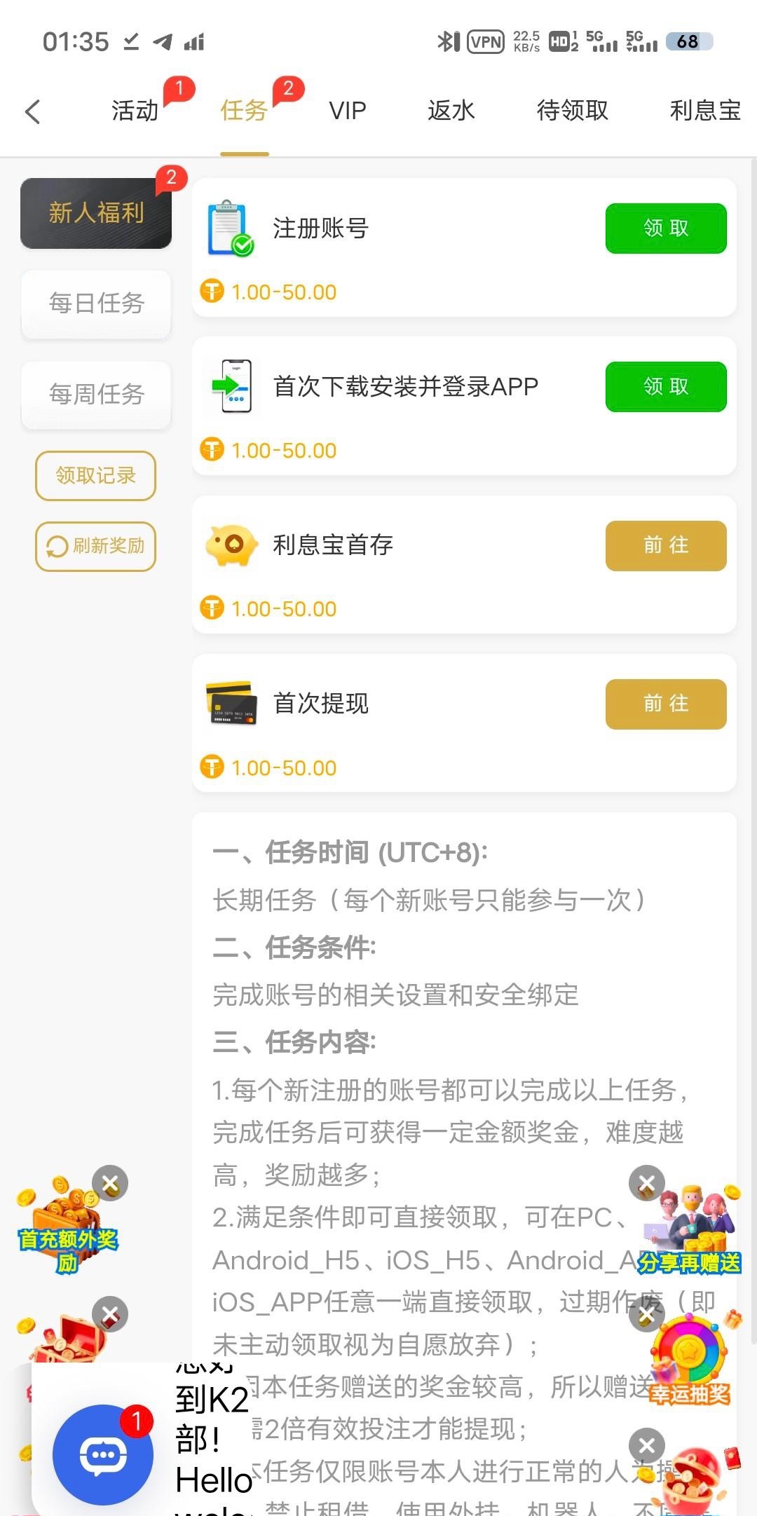 6u.ag进不去的开vpn注册+绑定地址+下载app任务中心领取大概4-5u 提现自测