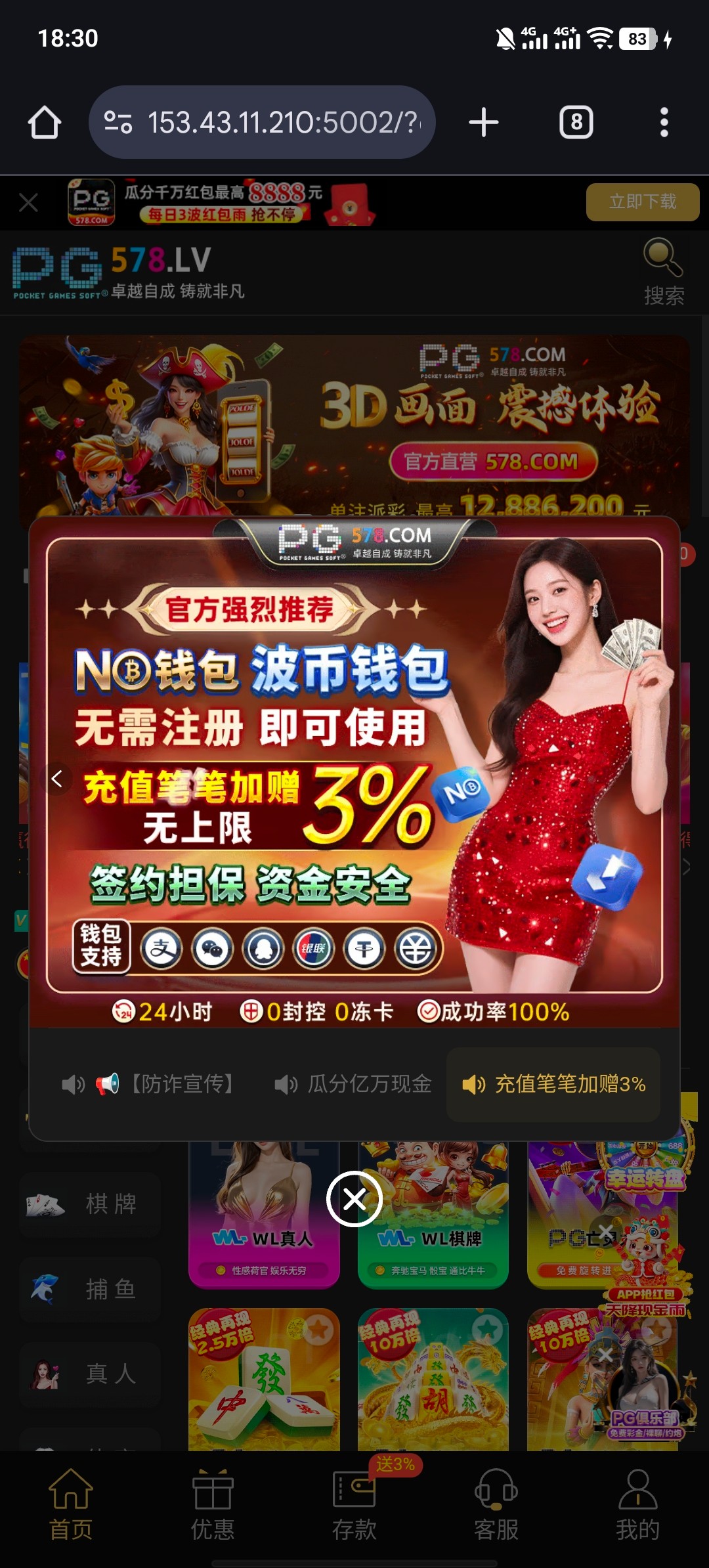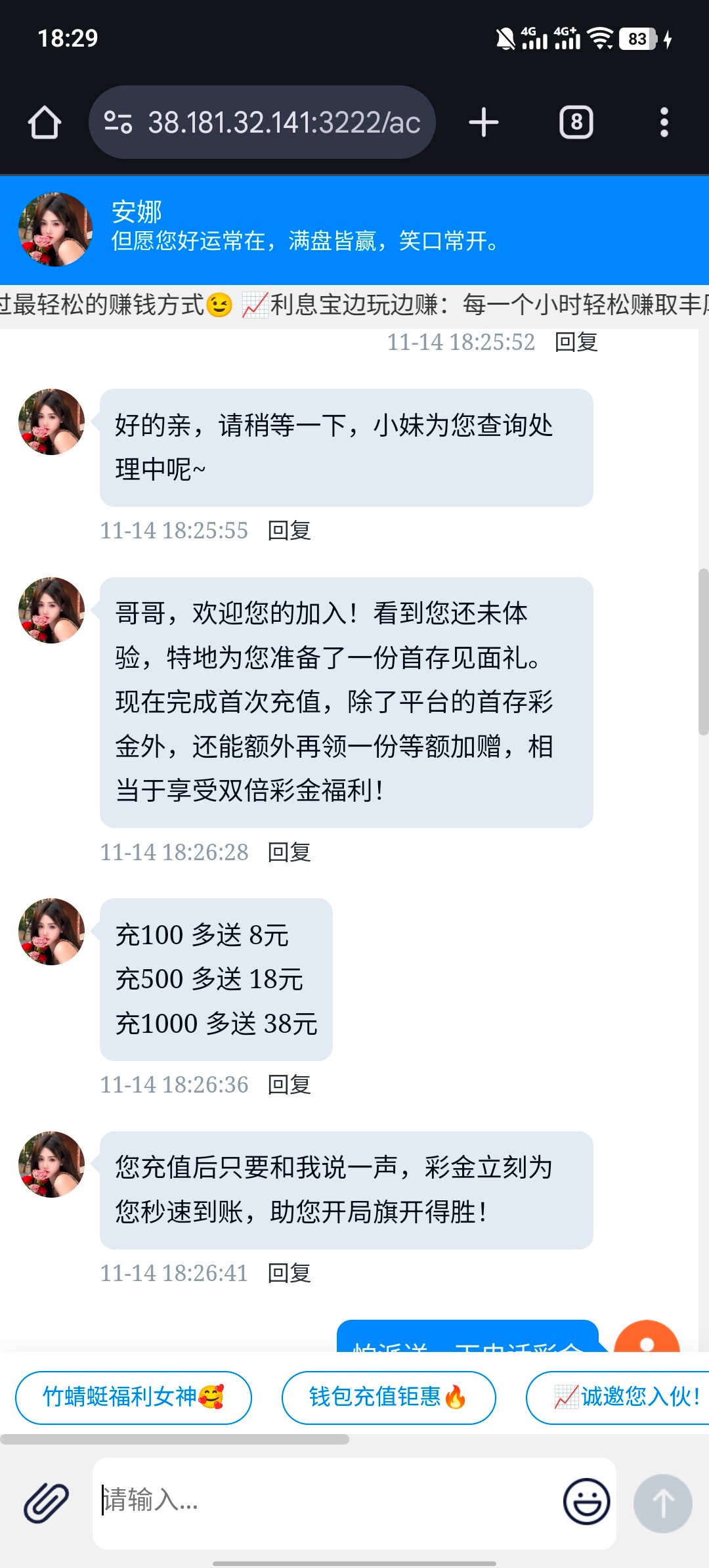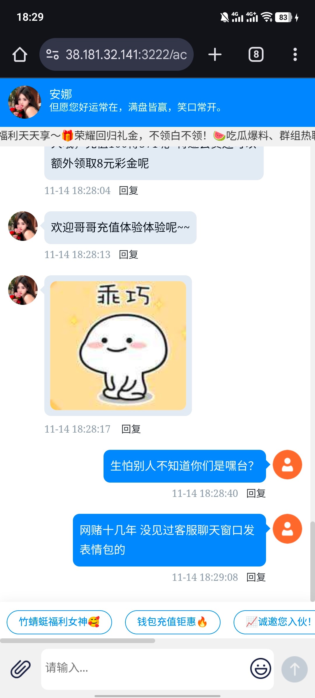 电话打过来说不用充值 然后联系客服了 让我充值100领取双份特邀彩金 哈哈 然后给我发表情包 跟他妈 黄播黑台一模一样 遇到谨慎充值 包半黑的 这种网站域名 自测