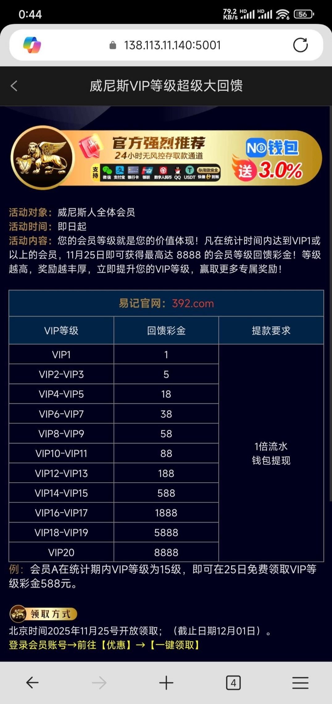 392.com和806.com,有VIP等级就可以领取,打一倍流水,最低提现10元起