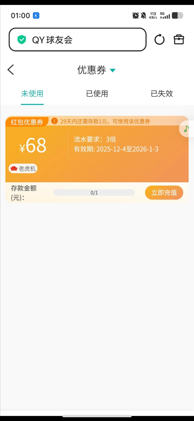 官网QYH.VIP 有过充值的可以去看看 用电话号码登录 上去看到 充1块有个优惠券68