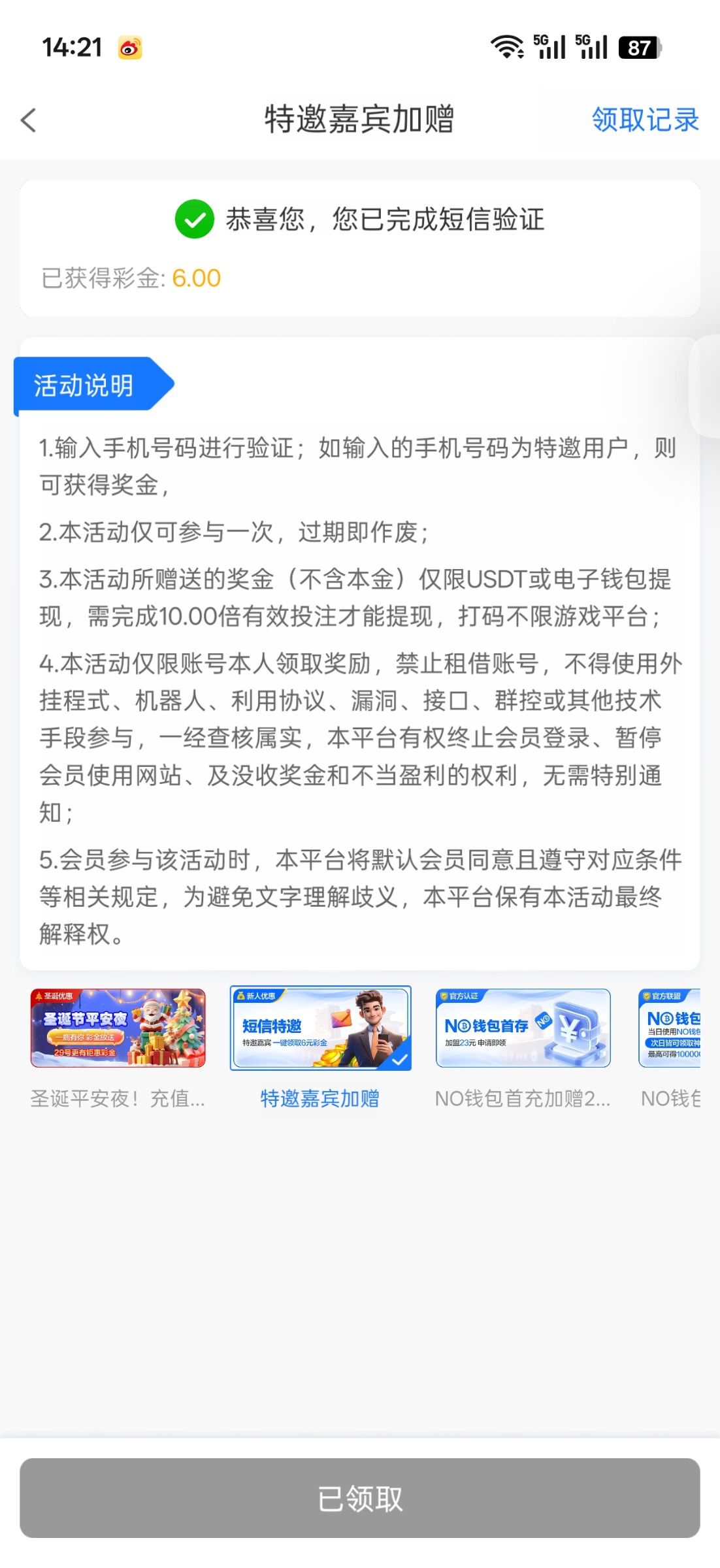 收到短信去的给了6赌神彩金,不知道黑不黑