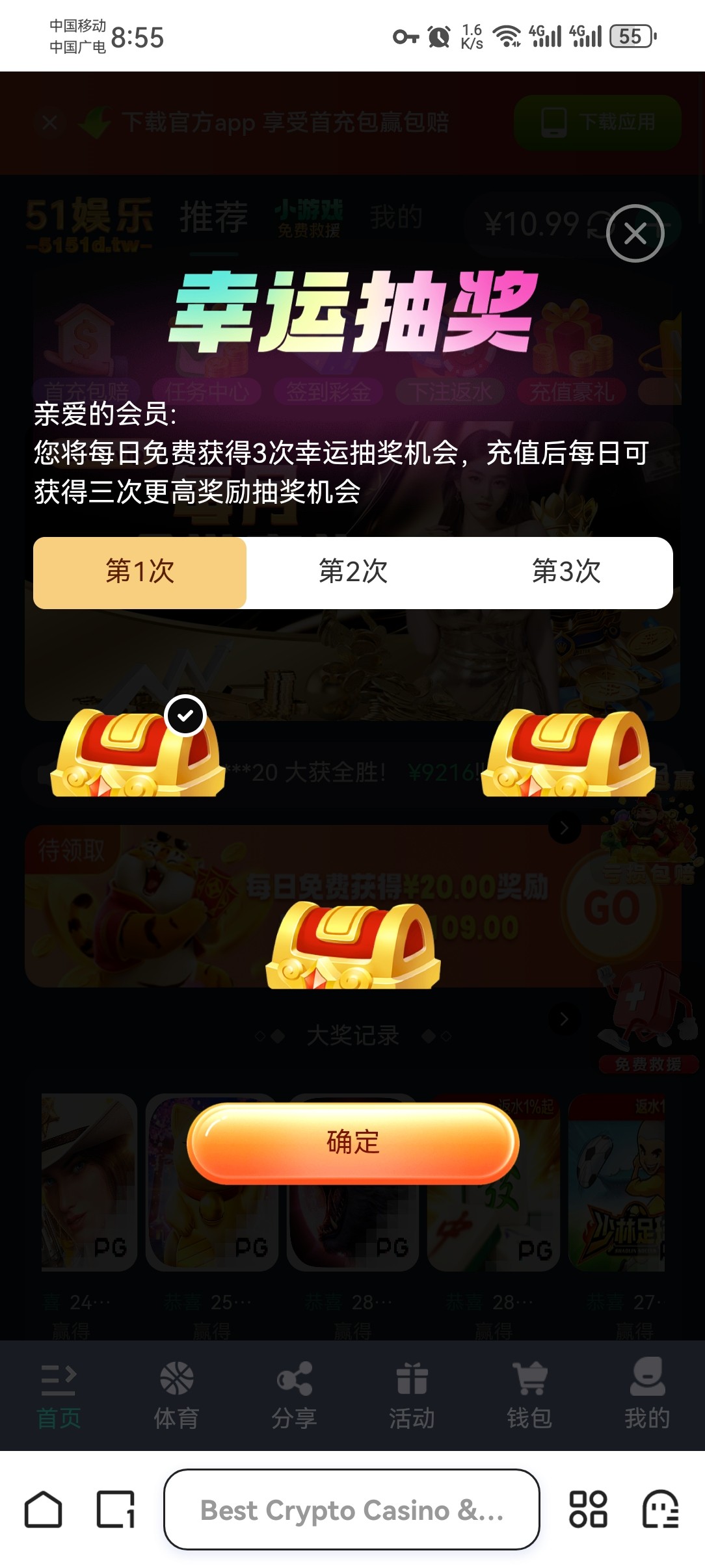 置顶评论 点:注册下载 就能打开网站,自己斟酌撸款白嫖,我打了20几个号,出了一个1200一个600,清除浏览器数据换ip重新撸,点签到宝箱没提示“ip已签到”就能继续干,还有出款不要出同名,找朋友拿支付下