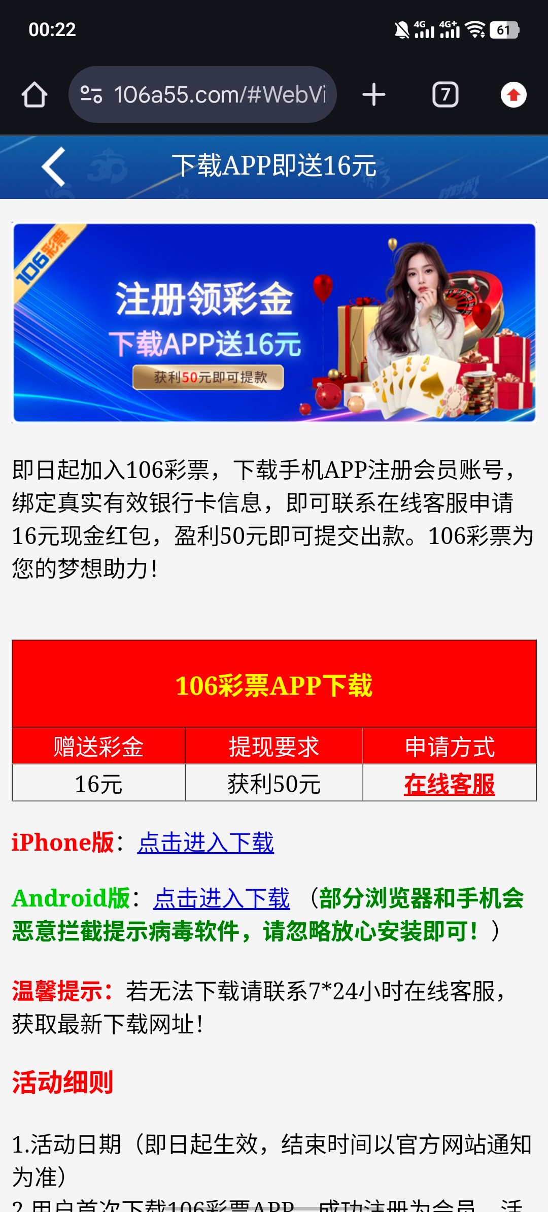 下载app完善信息 联系在线客服 申请app彩金 送16彩金 无需流水 最低50提现 严查ip