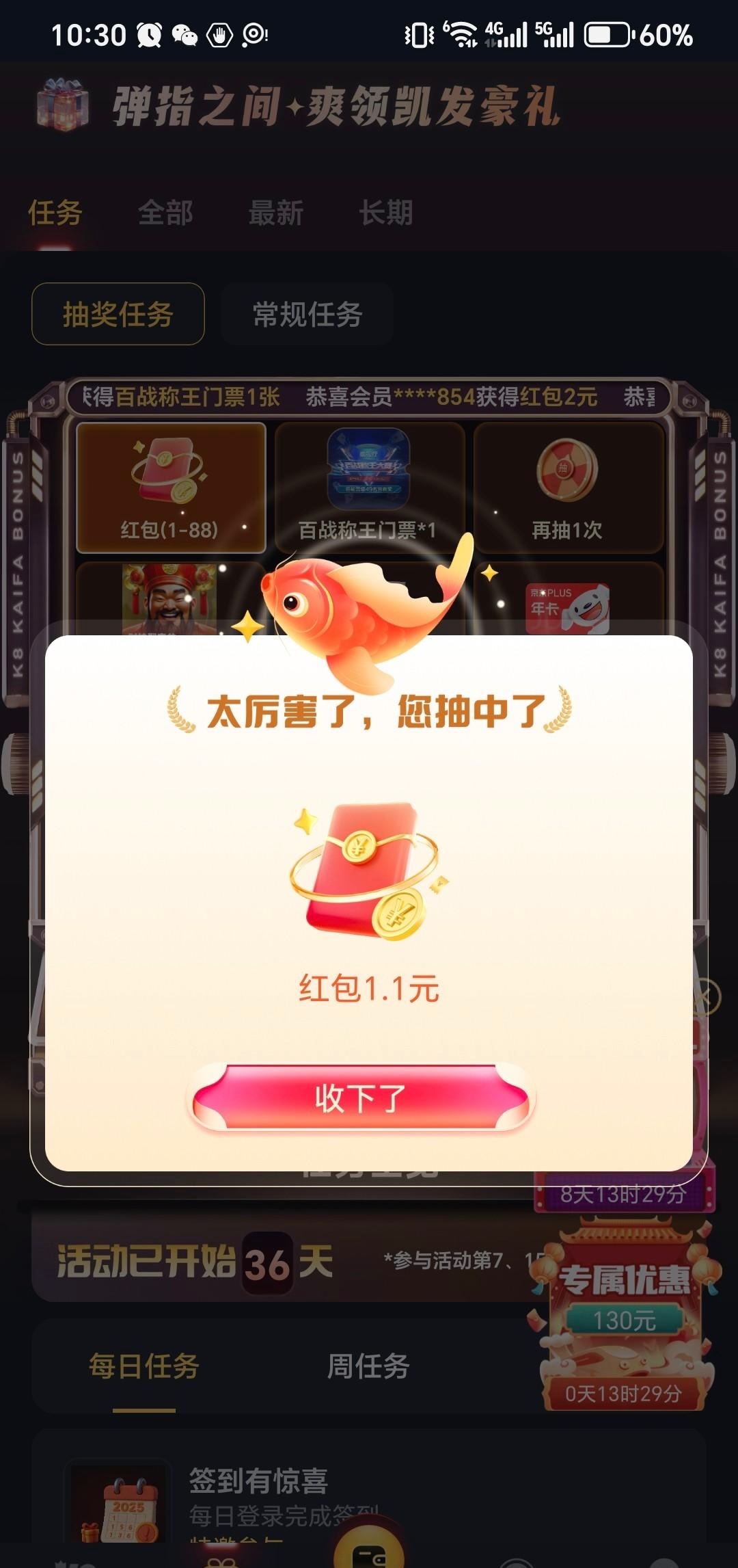 登录账号,我图里这个限时抽好礼,点进去,每天都可以签到(签到之前随便点个电子进去不用玩过几分钟再回这个界面就可以签到),基本就是三种奖品,红包或者pp免费旋转或者百家乐门票,都有用。很久没充值过一个月一直在白嫖,pp那个爆奖也有几十,然后自己去打过关啥的,我今天今天十多块又打上400,有号的可以看看自己有没有这个活动,不知道是不是都有。网址k8.com