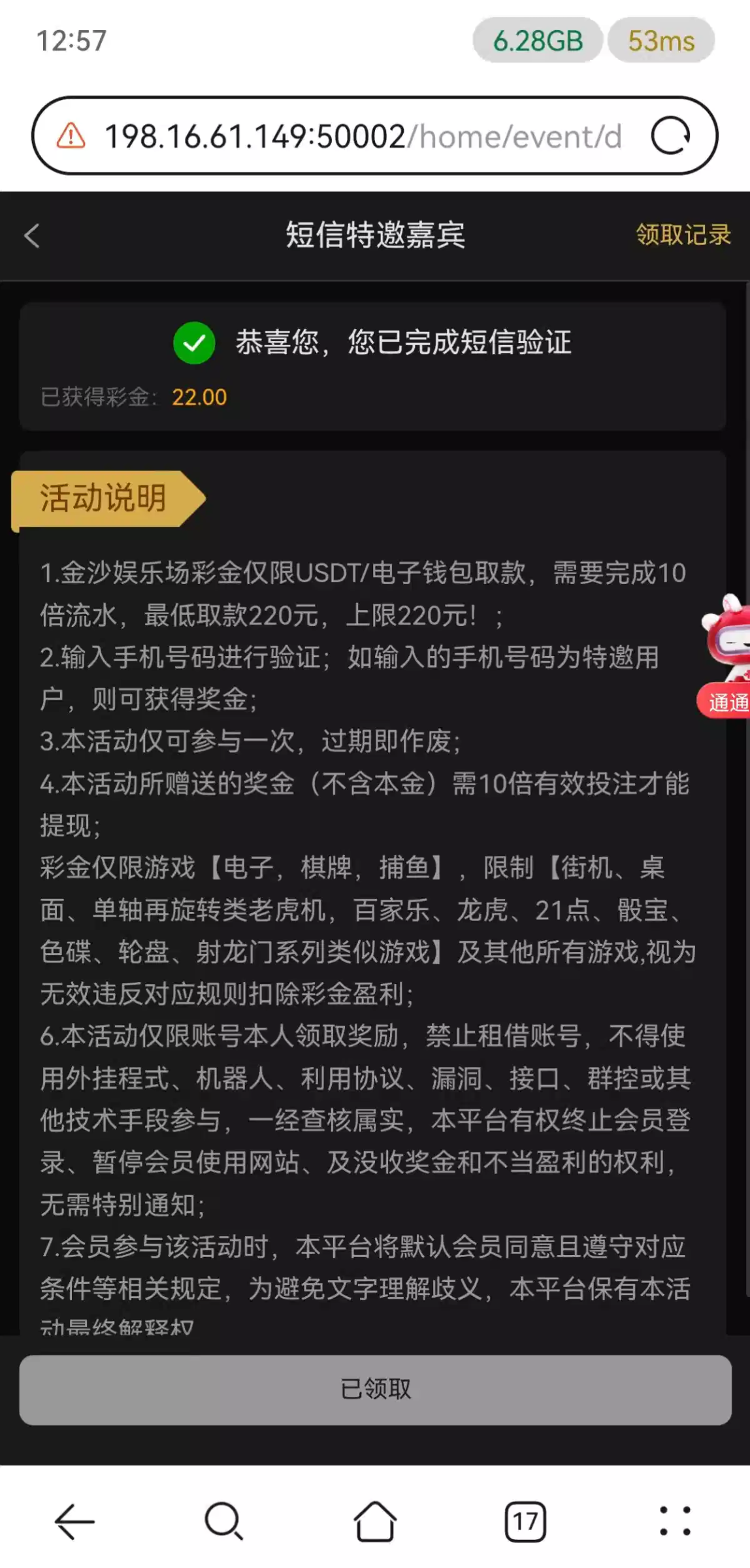 去年领过一次,把之前领过的账号换绑手机,然后重新注册一个号,名字重复也可以。特邀彩金提现只能提u或者钱包,有领过的老哥可以去试一下,我这次打出来220,提现钱能到了还有app登录彩金