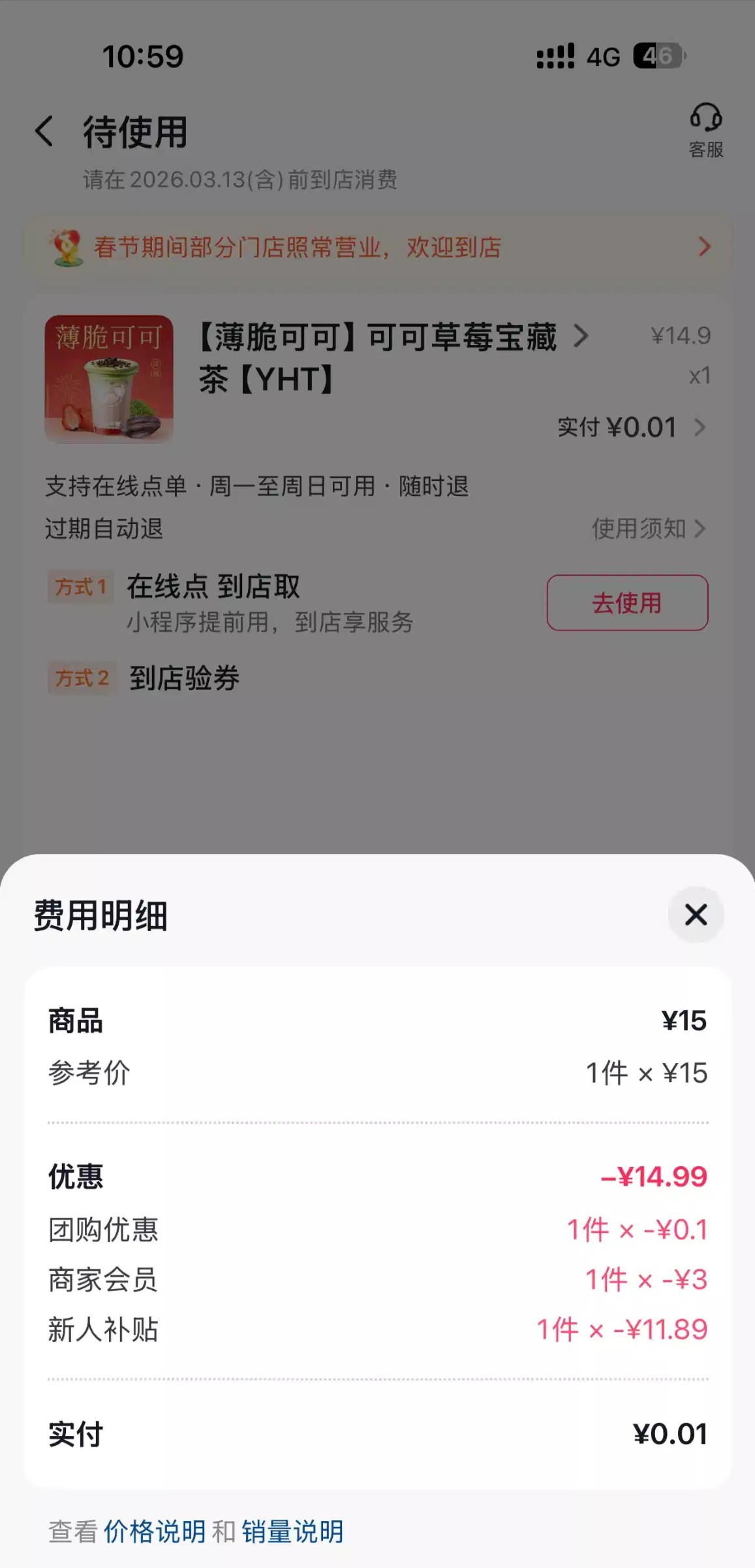 抖音团购 搜索 益禾堂 有新人 入会0.01 买一杯奶茶 没用过一般都有,到店自取