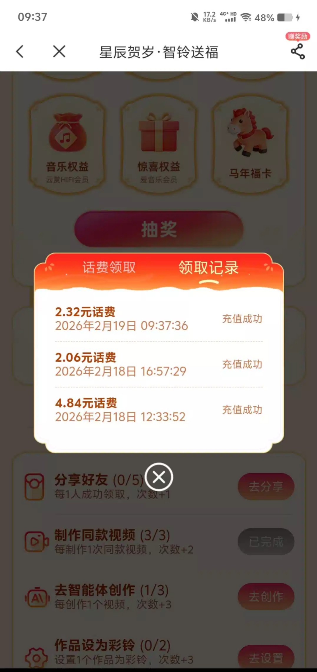 进去后免费抽5次,任务点一下就有20次,可以抽10多元话费
