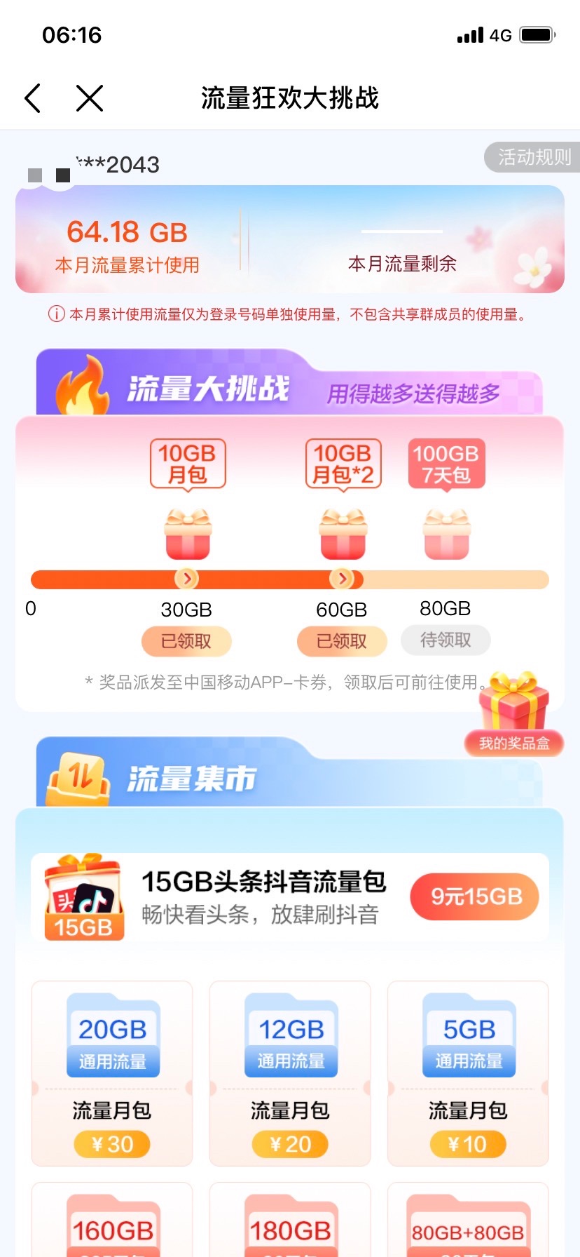 移动app ,搜流量狂欢, ,点进去,领了60G月包, ,每个人的不同,基本上都有