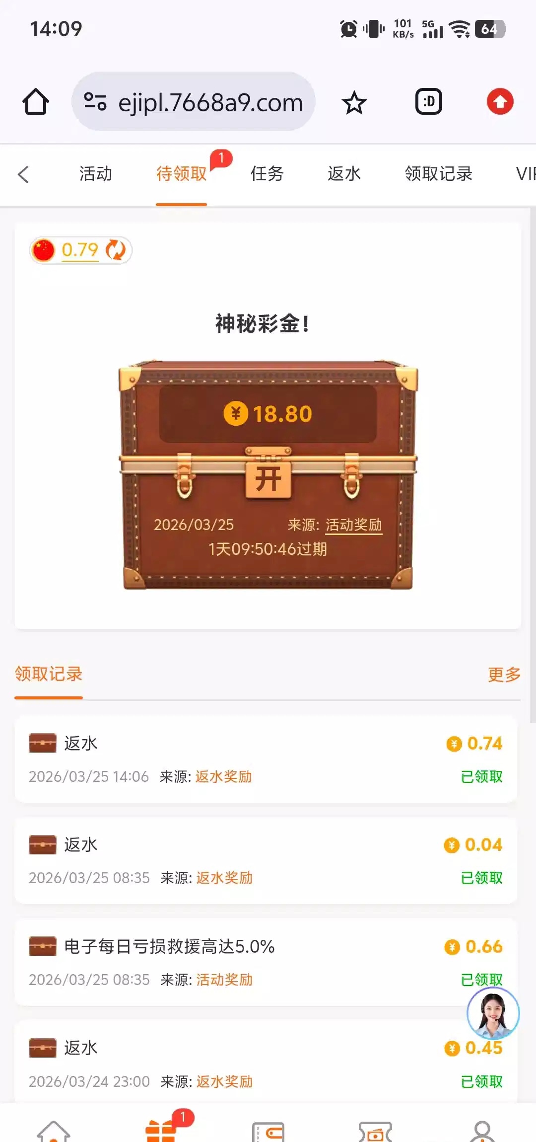 今日用钱包充值任意金额给彩金,我冲了10给了18.8